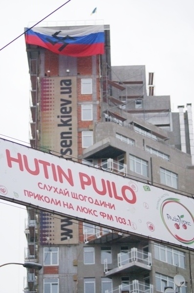 Рано утром 16.09.2014 г. жители столичной Лукьяновки обнаружили на строящейся многоэтажке по адресу ул. Артема, 84-А гигантское трехцветное полотно с фашистской символикой.